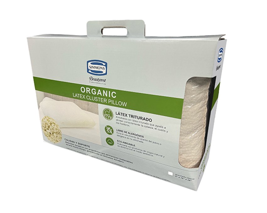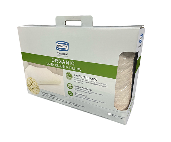 Almohada con latex triturado que ayuda a alinear correctamente la columna apoyando las curvas naturales de la cabeza, el cuello y los hombros.