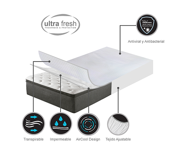 El protector de colchón Beautyrest Ultra Fresh, le proporciona mayor durabilidad y rendimiento a tu colchón. Ofrece protección impermeable contra derrames de líquidos, polvo y bacterias. La tecnología HeiQ Viroblock crea un ambiente limpio, libre de microbios, gérmenes y virus cuidando tu salud. Reduce las colonias de ácaros en tu colchón que son las causas principales de alergias respiratorias. El protector de colchón Beautyrest no altera la sensación de confort, gracias a su tejido stretch tecnológicamente avanzado que se ajusta a tu colchón.